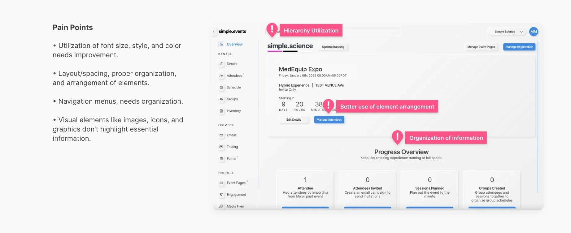 SimpleEvents, a platform for managing in-person, virtual, and hybrid events, was struggling with low user engagement and inefficient workflows. Employees and clients found the platform difficult to navigate, resulting in significant friction during event planning, promoting, and production stages. The tool was not meeting the needs of its users, impacting both internal teams' productivity and clients' event planning experience.